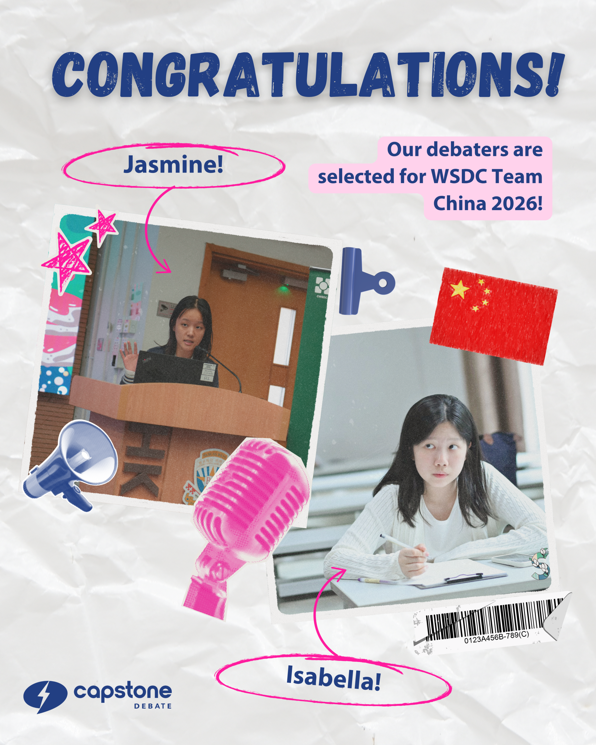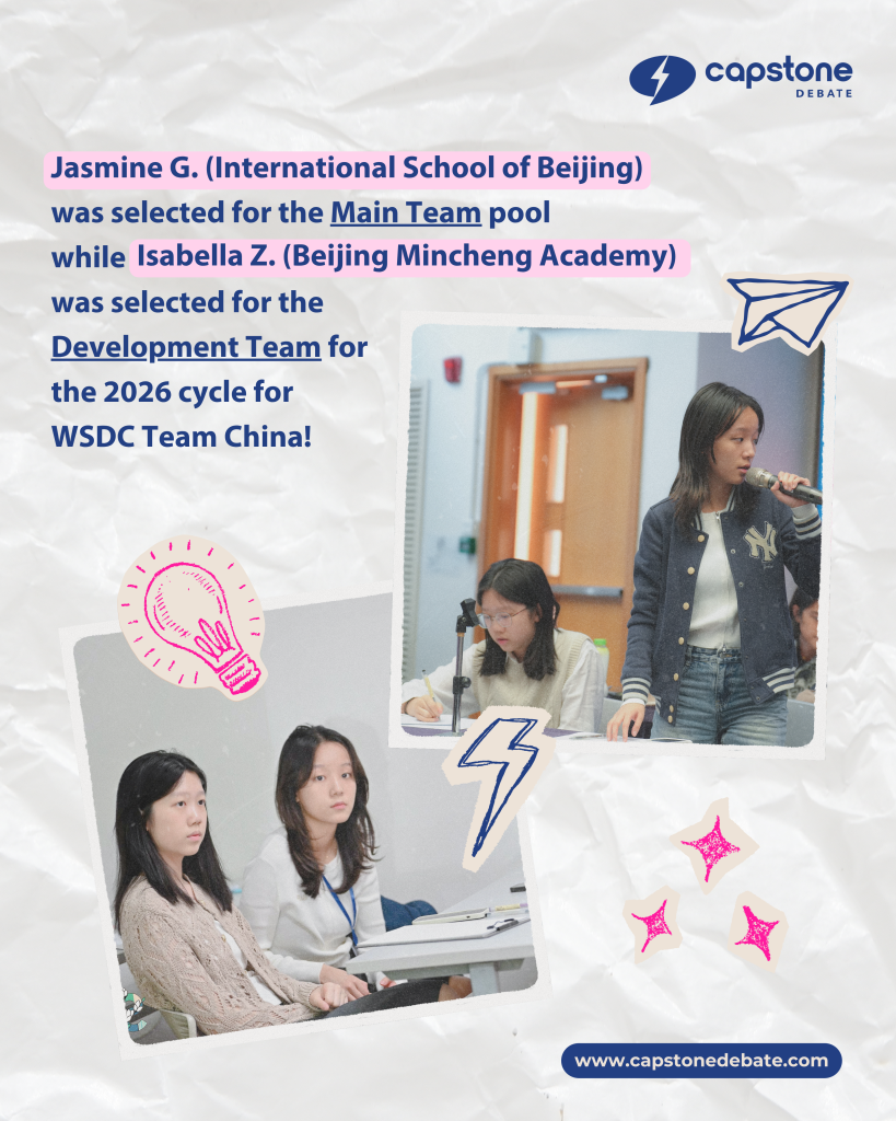 Jasmine has been selected for the Main Team Pool, while Isabella has earned a well-deserved spot on the Development Team for Team China 2026 at the World Schools Debating Championship (WSDC)!